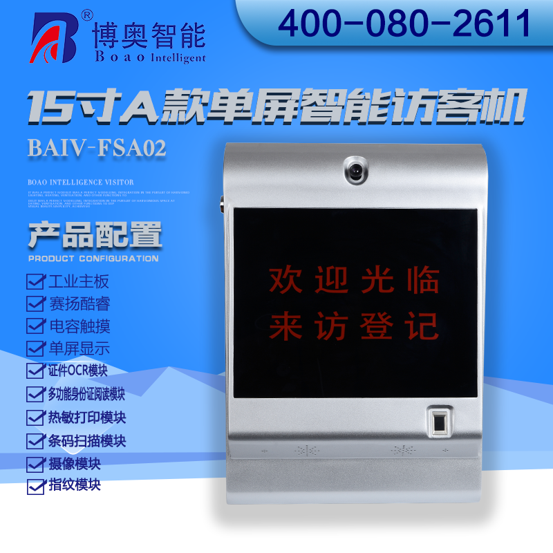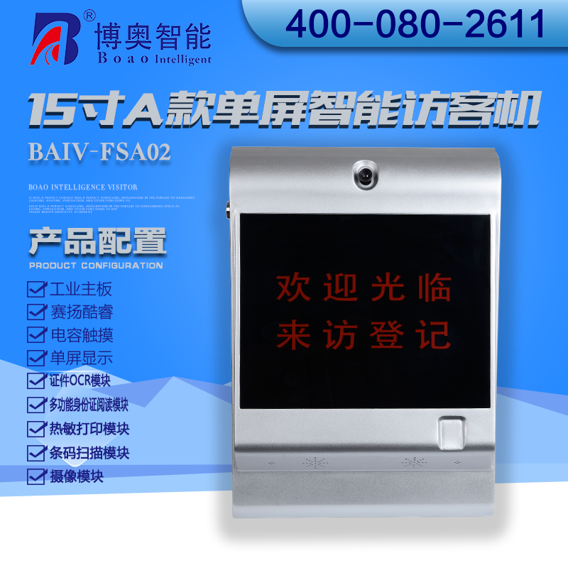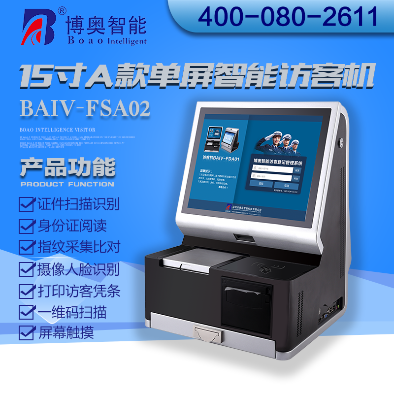 ? ? ? ?15寸A款雙屏智能訪客機利用計算機、觸摸屏手寫、證件識別(OCR),射頻識別、指紋生物識別、熱敏打印、條碼、數(shù)碼攝像、自動制證、硬件加密、網(wǎng)絡(luò)等技術(shù)實現(xiàn)智能信息化訪客登記管理,將目前手工填寫出入登記管理、電話咨詢被訪人等傳統(tǒng)方式轉(zhuǎn)變?yōu)楦呖萍嫉挠嬎銠C化、信息數(shù)字化處理,消除了手寫登記填寫時間長,容易出錯,信息缺失虛假多,不易保存,信息查詢困難等種種弊端;訪客登記管理系統(tǒng)能夠準確快速的對來訪人員的證件、圖像、指紋等信息進行識別登記并保存,以便日后查詢,同時利用聯(lián)動功能,可以對進出車輛自動識別登記。