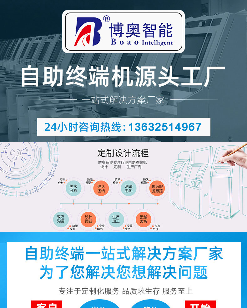 深圳市博奧智能科技有限公司專業(yè)提供自助終端機、觸摸查詢一體機、廣告機、液晶顯示器等產(chǎn)品的硬件、軟件研發(fā)與設(shè)計加工OEM/ODM等一站式服務(wù);我們一直秉承以產(chǎn)品質(zhì)量為核心、客戶至上、服務(wù)共贏為宗旨,為金融、醫(yī)療、教育、人工智能、政府工程項目、智慧城市、軌道交通、商業(yè)自助服務(wù)、廣告?zhèn)髅降刃袠I(yè)提供質(zhì)量過硬的產(chǎn)品和優(yōu)質(zhì)的服務(wù)。