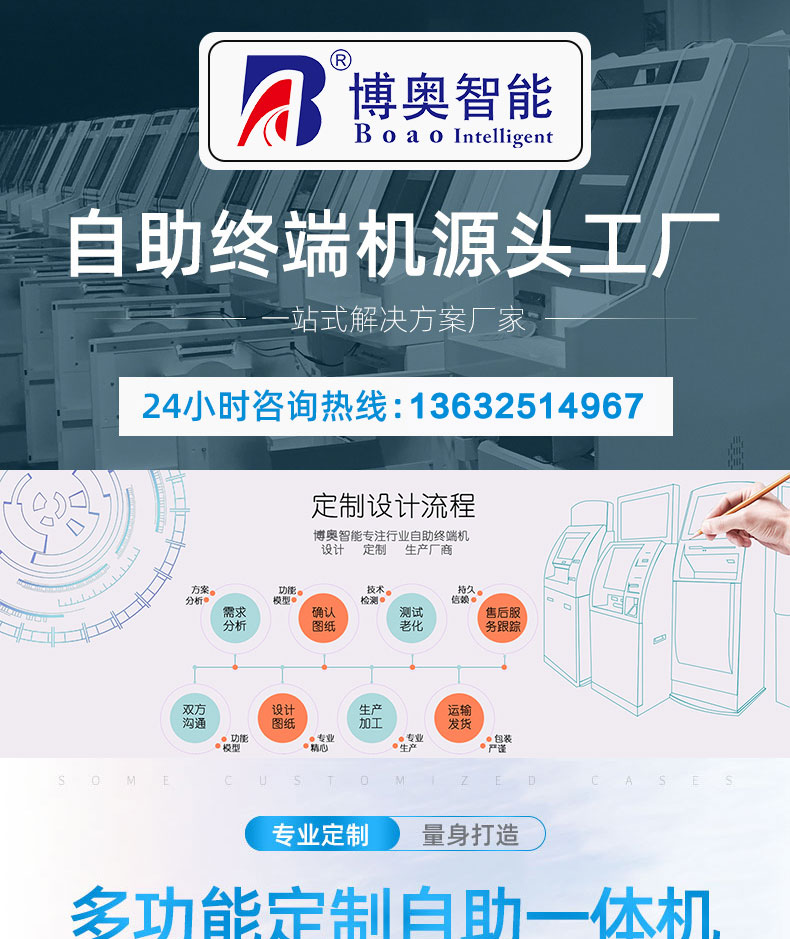 深圳市博奧智能科技有限公司專業提供自助終端機、觸摸查詢一體機、廣告機、液晶顯示器等產品的硬件、軟件研發與設計加工OEM/ODM等一站式服務;我們一直秉承以產品質量為核心、客戶至上、服務共贏為宗旨,為金融、醫療、教育、人工智能、政府工程項目、智慧城市、軌道交通、商業自助服務、廣告傳媒等行業提供質量過硬的產品和優質的服務。