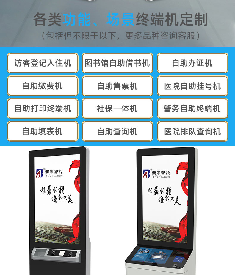 深圳市博奧智能科技有限公司專業(yè)提供自助終端機(jī)、觸摸查詢一體機(jī)、廣告機(jī)、液晶顯示器等產(chǎn)品的硬件、軟件研發(fā)與設(shè)計(jì)加工OEM/ODM等一站式服務(wù);我們一直秉承以產(chǎn)品質(zhì)量為核心、客戶至上、服務(wù)共贏為宗旨,為金融、醫(yī)療、教育、人工智能、政府工程項(xiàng)目、智慧城市、軌道交通、商業(yè)自助服務(wù)、廣告?zhèn)髅降刃袠I(yè)提供質(zhì)量過硬的產(chǎn)品和優(yōu)質(zhì)的服務(wù)。