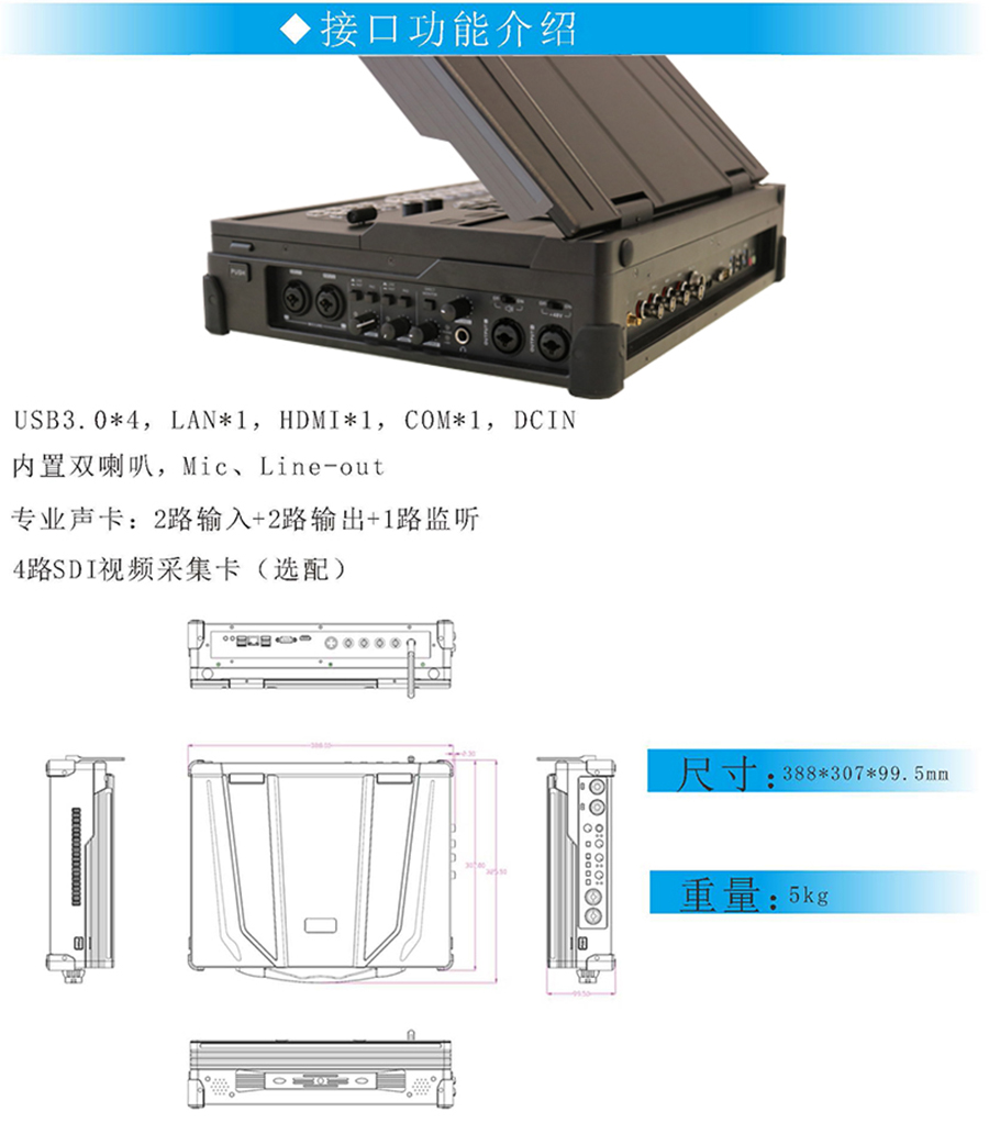 便攜式工控筆記本計算機鋁鎂合金外殼CNC一體成型,外觀精美,重量輕,方便攜帶;結構設計合理,達到工業級標準,具有防振防塵等特點,為客戶量身定制產品,集成15.6高清屏,Intel 6核高性能處理器,內置視頻采集卡、專業聲卡、專業導播鍵盤;產品應用于廣電行業和教育行業的入門級導播/直播,同時根據需求為您提供外觀功能設計定制服務