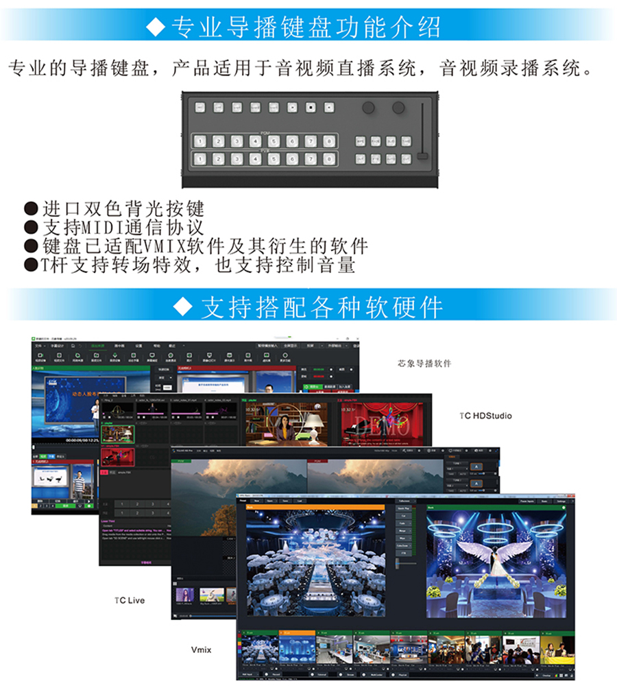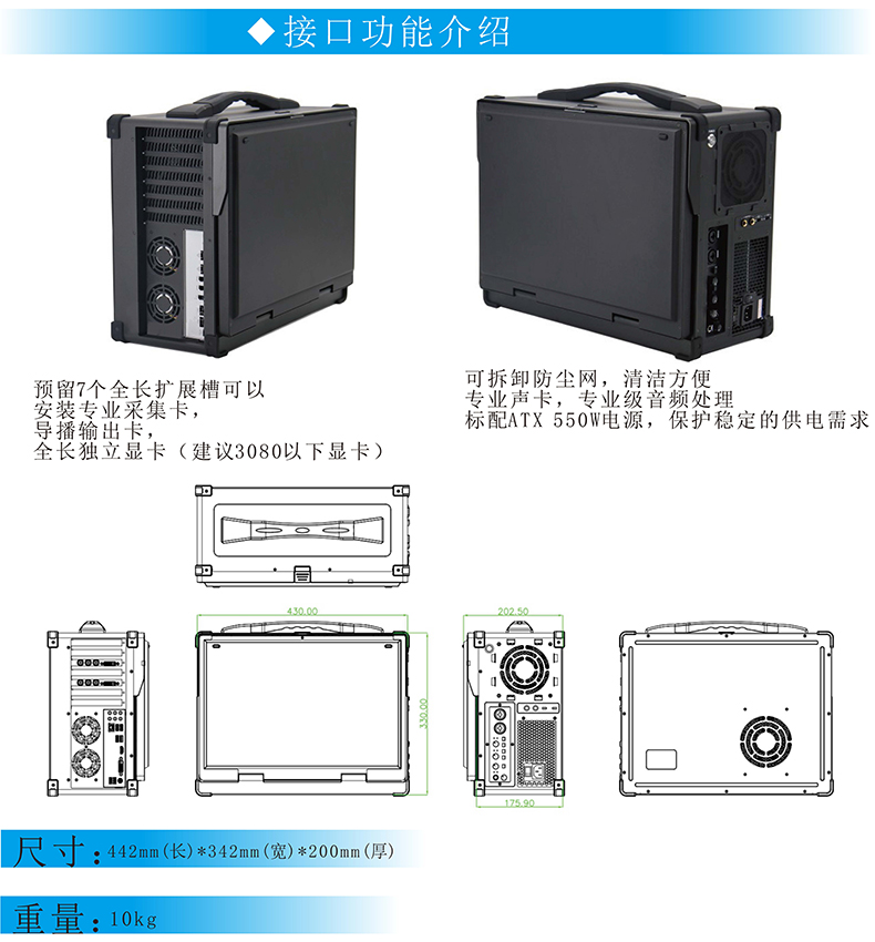 廣電影視導播直播錄播系統一體計算機工業級加固防振室外高亮便攜式17.3寸工控電腦支持定制加工國產系統,采用鋁鎂合外殼,體積輕巧,性能穩定,方便攜帶等特點;集成導播鍵盤、音頻模塊、視頻加速卡、導播輸出卡、17.3寸高亮屏,保證戶外使用也清晰可見,用于廣電行業和教育行業的專業級導播/直播便攜設備。