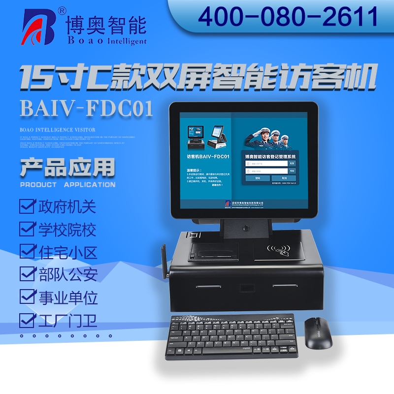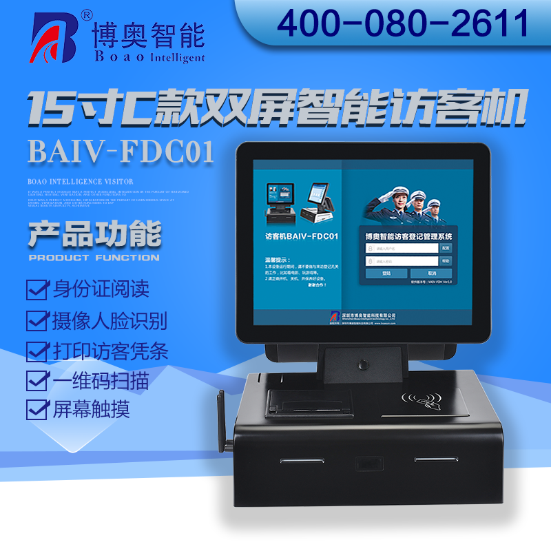 ? ? ? 15C款雙屏智能訪客機主要用在政府機關、關口、機場、軍隊、公安、法院、學校、事業單位、花園小區、高檔寫字樓、工廠等門衛傳達室用來訪客登記管理;辦公大廳、營業大廳、醫院等場所做為辦公設備