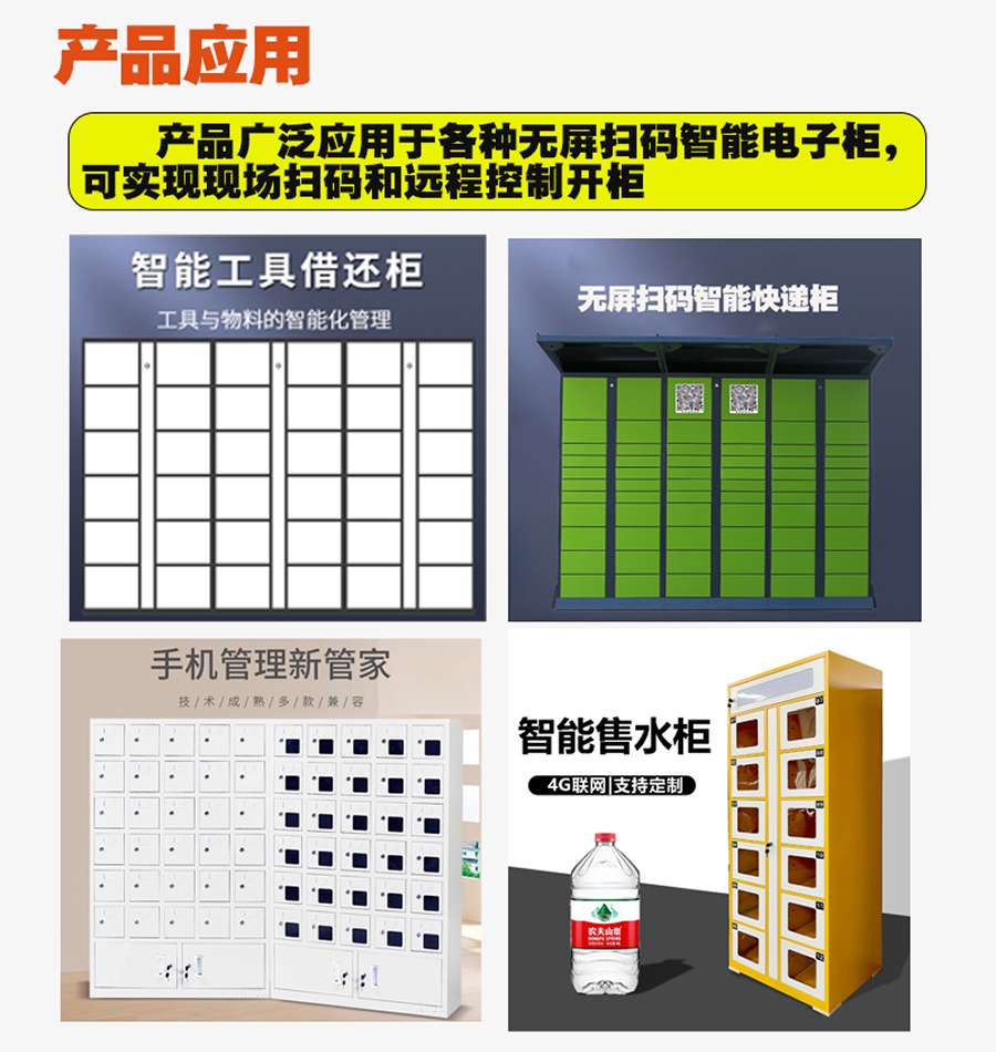 無屏掃碼智能柜鎖控板廣泛應用于快遞柜、儲物柜、信報箱、格子售販機、寄存柜、共享陪護床、洗衣柜等等。