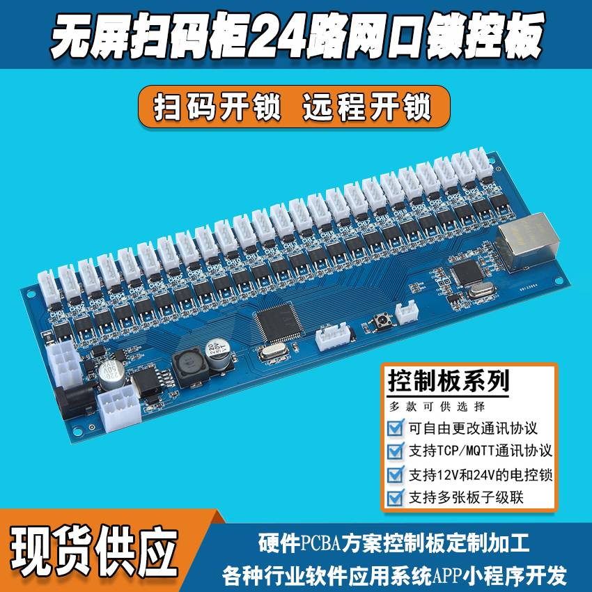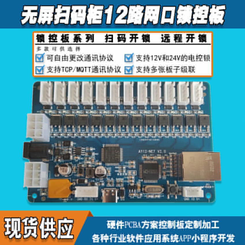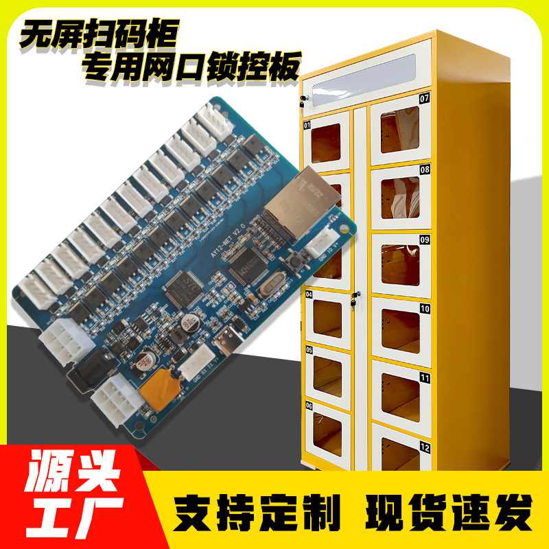 無屏掃碼智能柜網口鎖控板工廠現貨供應支持定制軟件管理系統小程序按需開發開發格子柜電磁鎖控制按需定制 免費開發工業控制 智能電器物聯家居主控PCBA方案硬件電路板