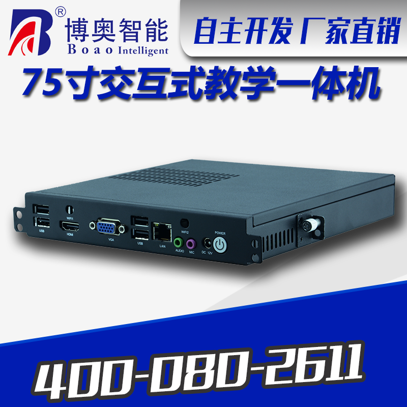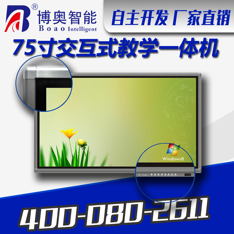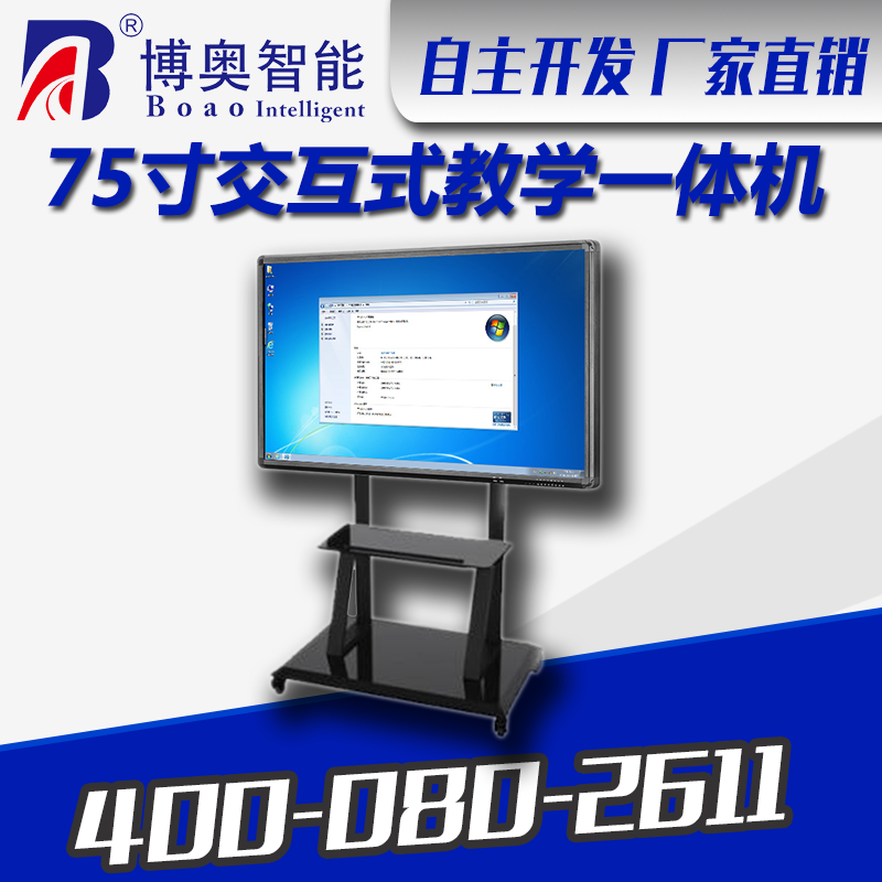 ? ? ?75寸交互式辦公教學一體機是由博奧智能自主開發(fā)生產(chǎn);采用鋁合金氧化拉絲工藝,將多點紅外鑰觸摸屏,LG原裝IPS 4K硬屏,高音質(zhì)喇叭、攝像頭工業(yè)控制主板集成為一臺交互式辦公教學一體機,內(nèi)部安裝智能化辦公教學軟件,完全替代“投影+計算機+無線WIFI+功放音響+電子講臺+電視機+高清視頻展臺(廣告機)”等分體式傳統(tǒng)復雜辦公教學設(shè)備,,將傳統(tǒng)的顯示終端提升為功能全面的人機交互設(shè)備,設(shè)備性能穩(wěn)定,安裝方便,操作簡單;通過此產(chǎn)品用戶可以實現(xiàn)書寫、批注、繪畫、多媒體娛樂以及電腦操作,直接打開設(shè)備即可輕松演繹精彩的互動平臺 ;由于交互式辦公教學一體機方案技術(shù)是博奧智能自主開發(fā)開生,提供配置、功能、尺寸等要求進行定制。