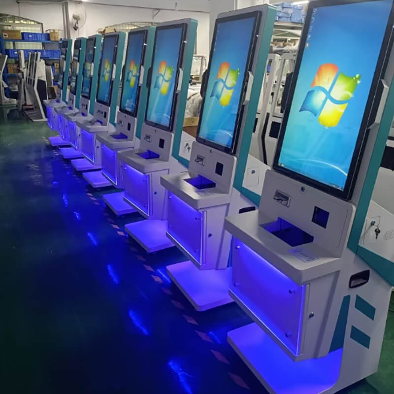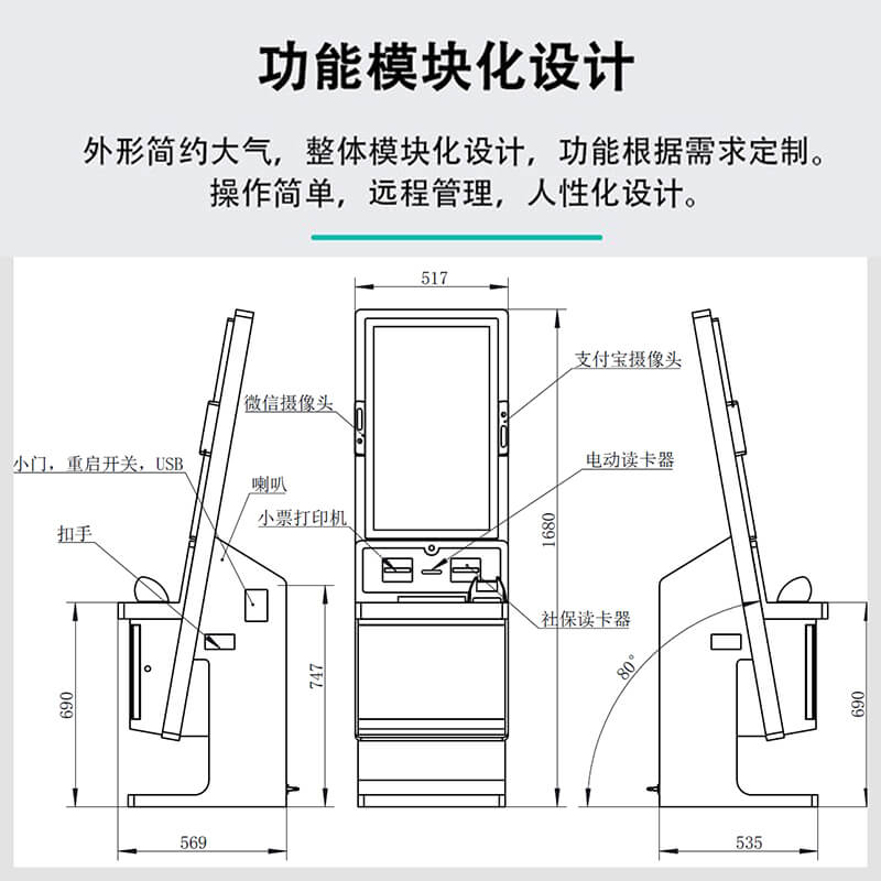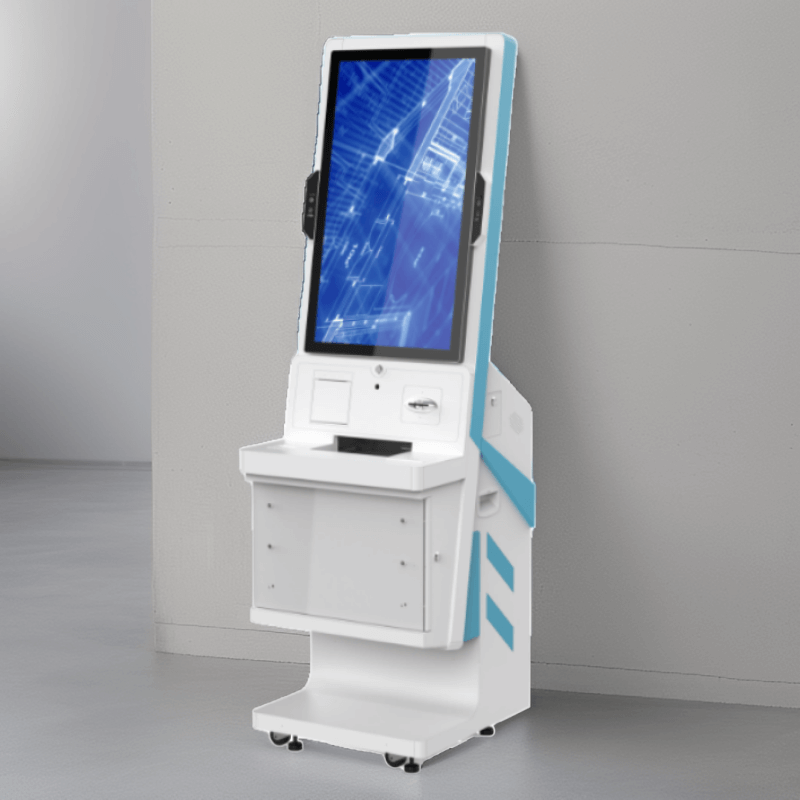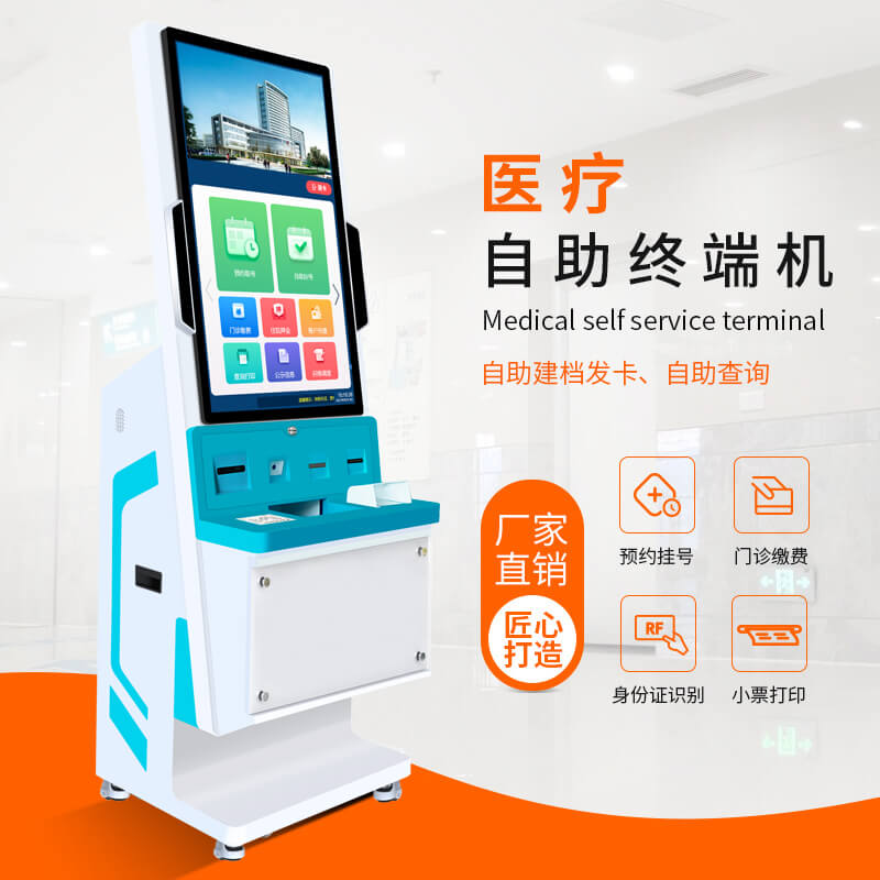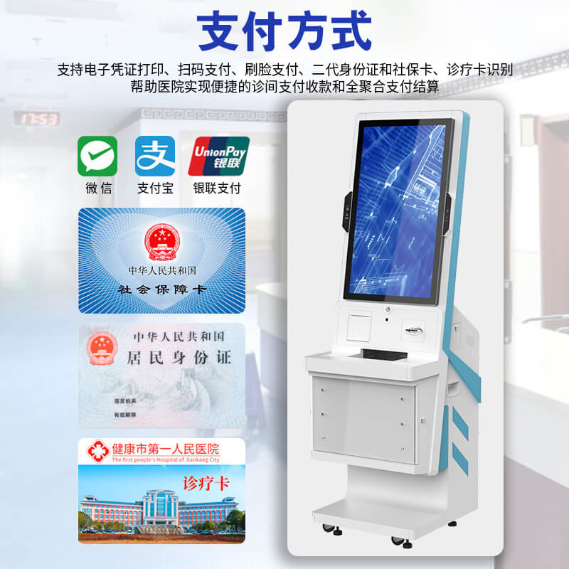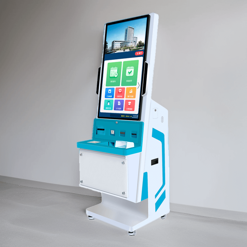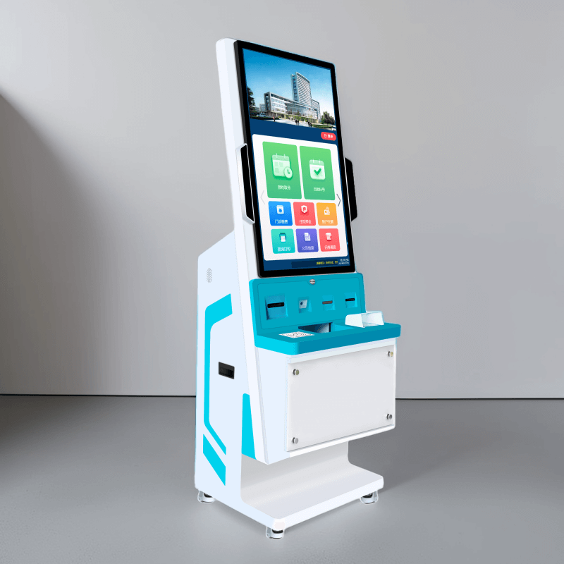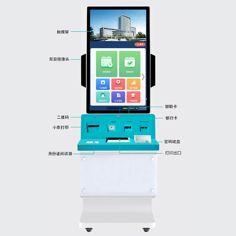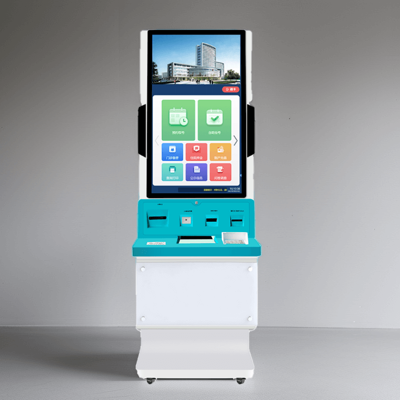 該終端機采用 32 英寸 IPS 高清觸控屏,分辨率 1920×1080,亮度 300cd/m2,響應時間 5ms,支持 10 點觸控;配備雙 200 萬像素支付寶 / 微信專用攝像頭,支持二維碼高速識別與光線自適應;集成符合 ISO 14443 標準的二代身份證讀卡器及全國統一社保接口的社保讀卡器;打印系統含熱敏式小票打印機(150mm/s 打印速度)與可選激光 / 噴墨 A4 打印機;處理器為四核 ARM Cortex-A55(2.0GHz 主頻,可選 Intel 賽揚),存儲 4GB RAM+64GB ROM(可擴展至 128GB);接口包括 4×USB 3.0、RJ45 網口、HDMI、DC 電源接口及 WIFI / 藍牙模塊;電源 AC 220V±10%/50Hz,功耗≤150W(待機≤10W),工作環境溫度 0℃~40℃、濕度 10%~90%(無冷凝)。